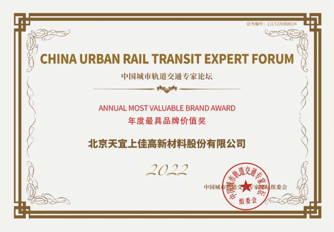 天宜上佳榮膺中國城市軌道交通專家論壇——“2022年度最具品牌價值獎”