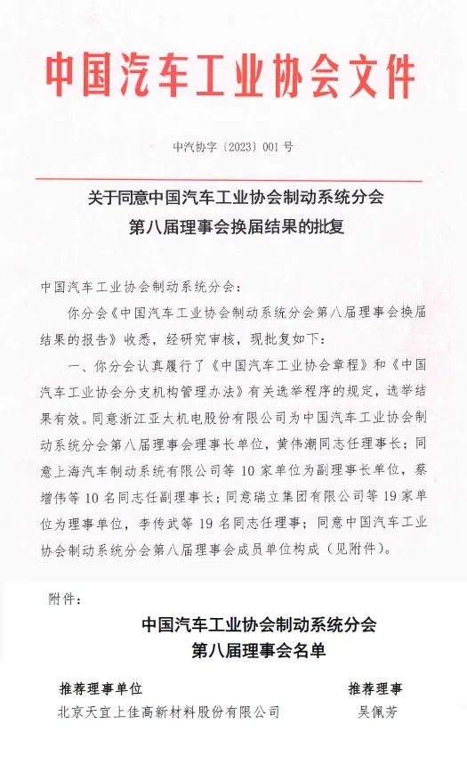 近日,中國(guó)汽車工業(yè)協(xié)會(huì)制動(dòng)系統(tǒng)分會(huì)第八屆理事會(huì)完成換屆,經(jīng)過研究審核,中汽協(xié)同意中國(guó)汽車工業(yè)協(xié)會(huì)制動(dòng)系統(tǒng)分會(huì)第八屆理事會(huì)成員單位構(gòu)成,北京天宜上佳高新材料股份有限公司等19家公司當(dāng)選理事單位,天宜上佳董事長(zhǎng)吳佩芳等19名同志擔(dān)任理事。