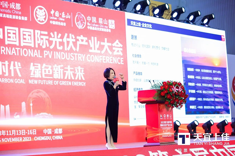 11月15日,在2023第六屆中國(guó)國(guó)際光伏產(chǎn)業(yè)大會(huì)主會(huì)議上,天宜上佳董事長(zhǎng)吳佩芳發(fā)表題為《堅(jiān)持長(zhǎng)期主義下的科技賦能,持續(xù)為光伏新能源創(chuàng)造價(jià)值》的主題演講。