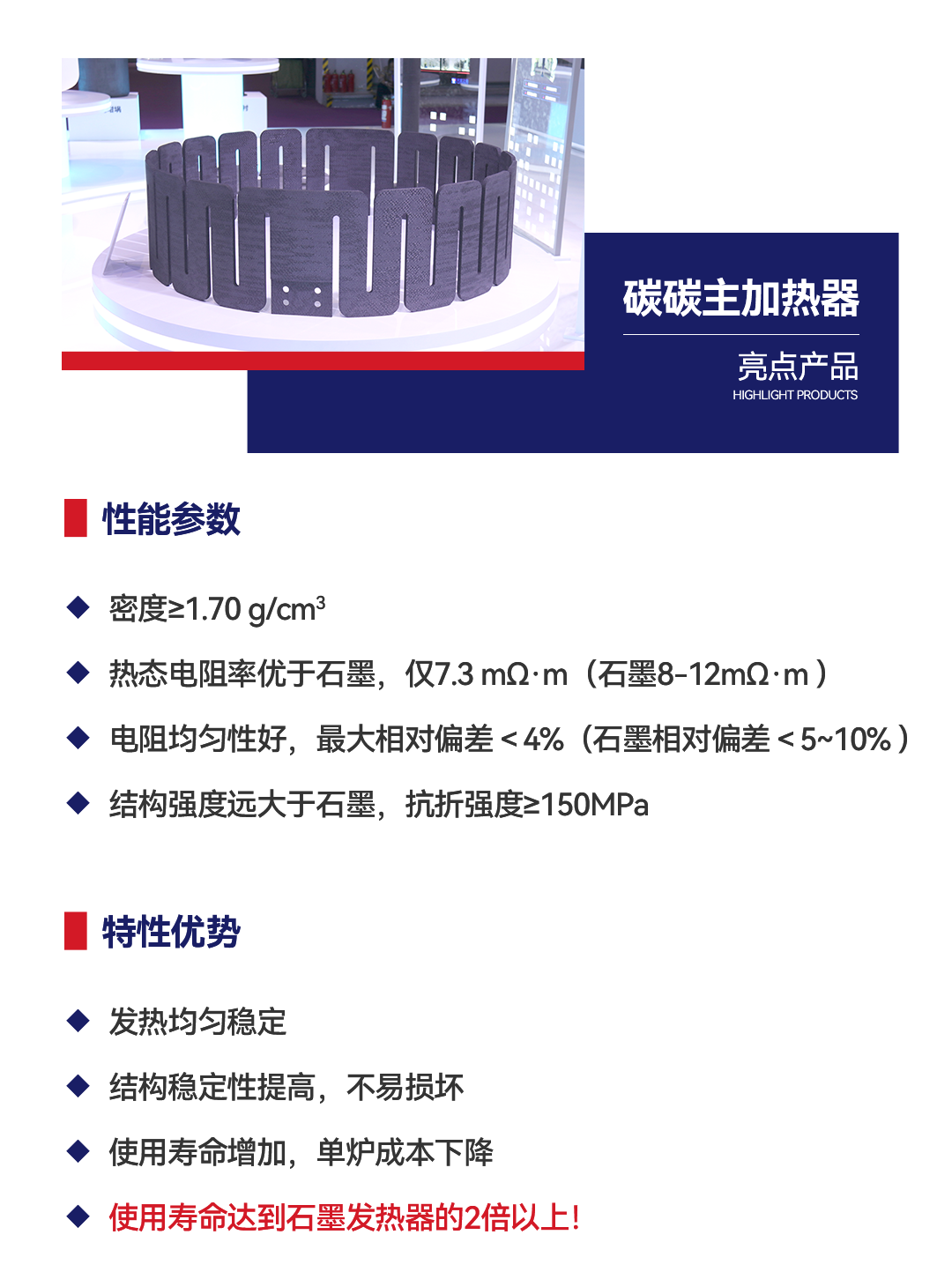 此次展示碳碳主加熱器、坩堝、導(dǎo)流筒、保溫筒、支撐環(huán)、托桿、護(hù)盤壓片等光伏單晶碳碳熱場(chǎng)系列產(chǎn)品,產(chǎn)品規(guī)格可滿足客戶定制化需求。