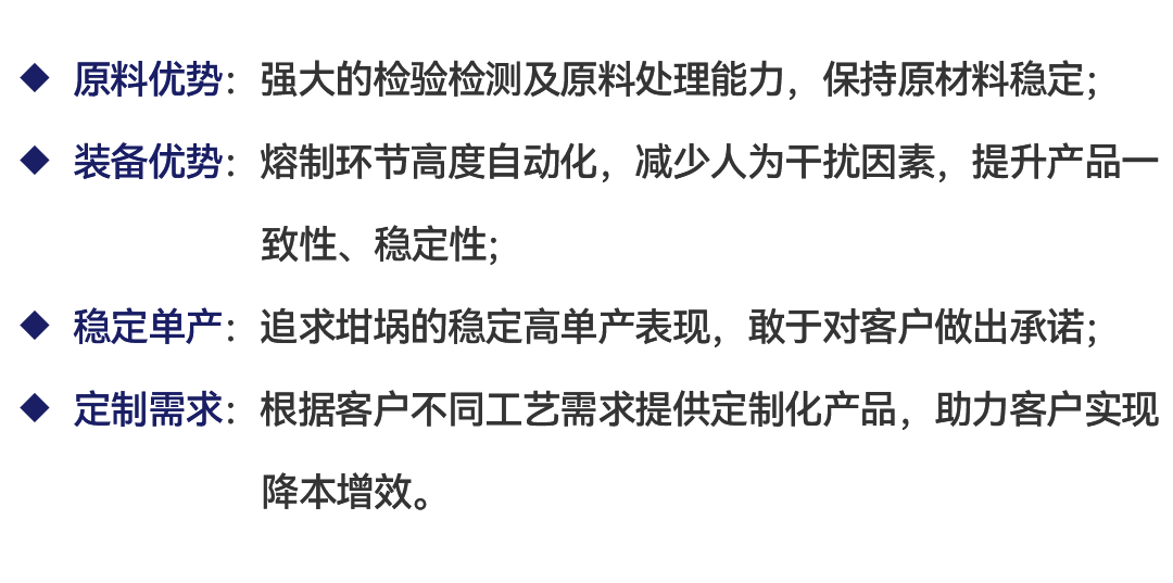 天宜上佳充分發(fā)揮集團(tuán)公司裝備大型化、自動(dòng)化、智能化、數(shù)字化的經(jīng)驗(yàn)與優(yōu)勢(shì),在熔制過程實(shí)現(xiàn)自動(dòng)稱料、自動(dòng)配料、自動(dòng)布料、自動(dòng)刮料,建立原輔料檢驗(yàn)檢測(cè)分析實(shí)驗(yàn)室、十萬級(jí)潔凈度檢驗(yàn)檢測(cè)室、單晶拉制輔材試驗(yàn)線,用于石英坩堝及碳碳熱場(chǎng)新產(chǎn)品、既有產(chǎn)品原料及工藝優(yōu)化性能驗(yàn)證。天宜上佳已與多家國(guó)內(nèi)頭部單晶硅生產(chǎn)企業(yè)開展合作,實(shí)現(xiàn)石英坩堝產(chǎn)品正式供貨。