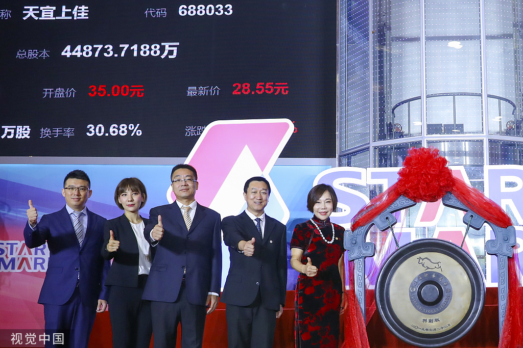 2019年7月22日,上海證券交易所內(nèi),北京天宜上佳高新材料股份有限公司董事長(zhǎng)吳佩芳(右一)出席科創(chuàng)板開(kāi)板儀式。